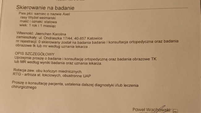 Podczas tej wizyty lekarz zwrócił uwagę na nienaturalny wygląd przednich łap Axela i zalecił dalszą diagnostykę.