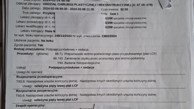 Od dłuższego czasu zmagam się z problemami lewej pięty. Po leczeniu odleżyny poszpialnej dokonano rekonstrukcji i przeszczepu w 2024 roku niestety doszło do powstania nerwiaka. Występuje brak czucia, a dodatkowo wystaje fragment kości, co powoduje ból, utrudnia chodzenie i codzienne funkcjonowanie. Miało być lepiej a jest coraz gorzej. Przede mną długie i wymagające leczenie oraz rehabilitacja.
