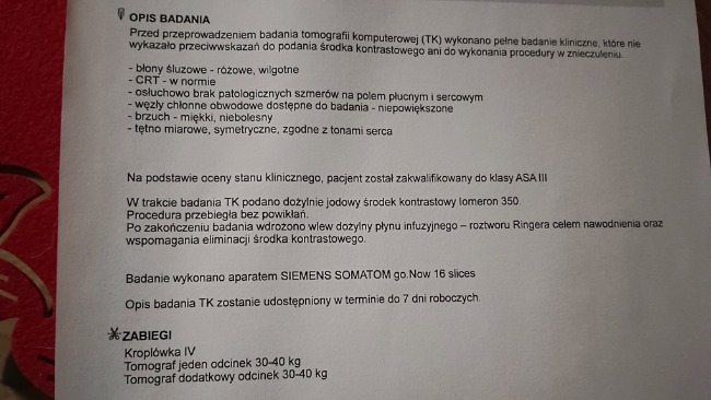 Teraz musimy wykonać TK - głównie kręgosłupa, ze względu na spondylozę na odcinku L6-L7, ale wskazane jest też ponowne, kontrolne prześwietlenie stawów (przód i tył).