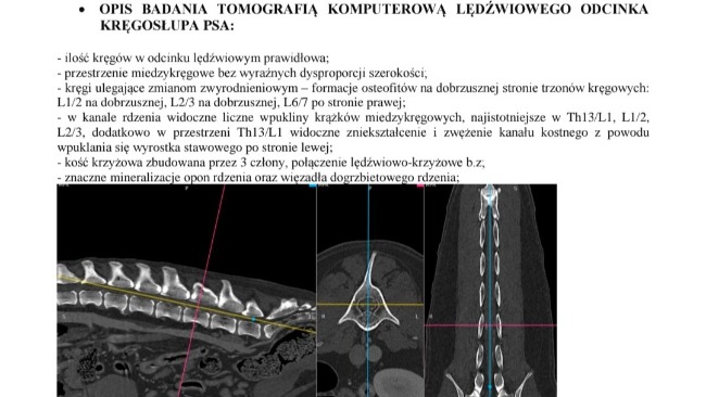 Pod koniec października Magnus miał robione TK (tomografię komputerową) - głównie kręgosłupa, ze względu na spondylozę na odcinku L6-L7, ale też ponownie, kontrolnie prześwietliliśmy stawy (przód i tył).