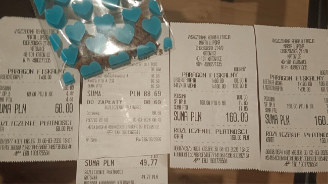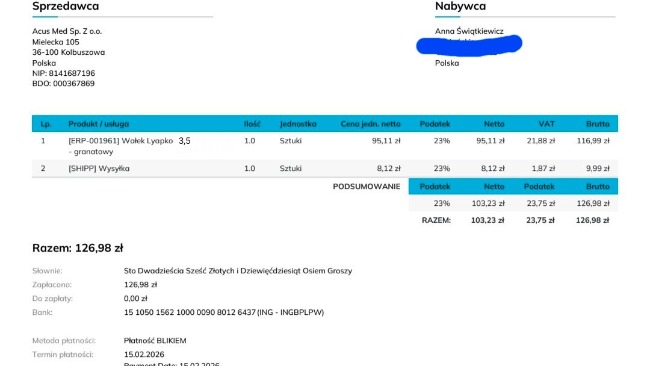 Wałek uniwersalny Lyapko 3,5 wykorzystuje zasadę działania znaną z akupresury - poprzez kontakt z igłami, skóra poddawana jest kontrolowanemu bodźcowi mechanicznemu. Wspomaga regenerację mięśni. Rachunek poniżej.
