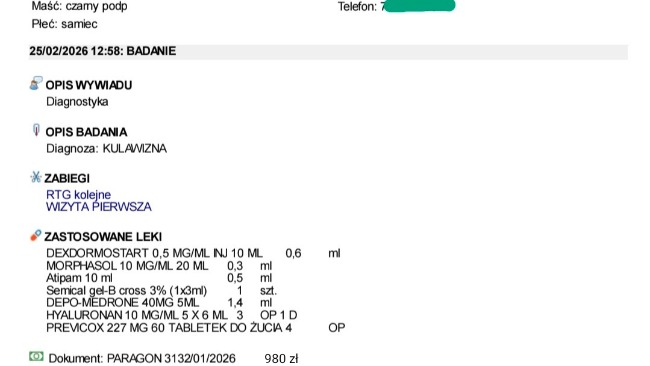 •Wstępna diagnostyka + RTG (na cito, bo nagle zaczął kuleć) - 400 zł