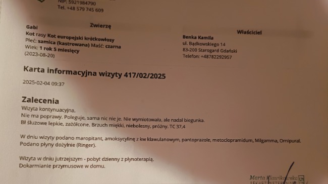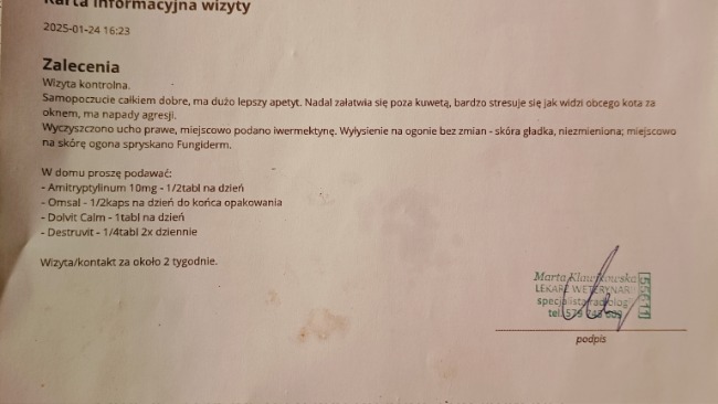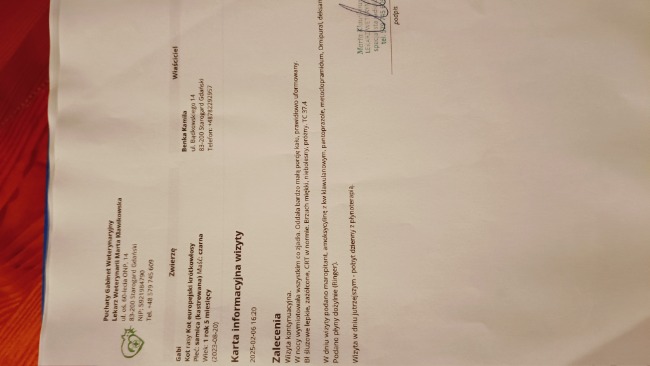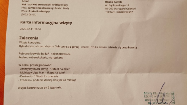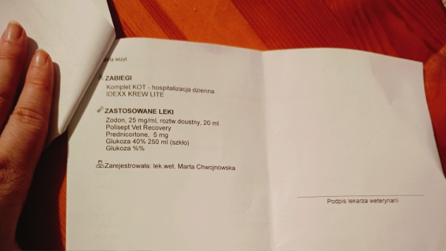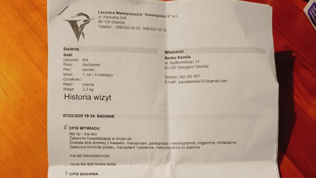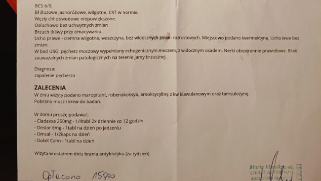 Jesteśmy już po wizycie u Pani weterynarz. Mamy zapisane leki uspokajające oraz antybiotyk i leki wspierające pęcherz. Musimy również zamówić specjalistyczną karmę, leki i suplementy. Czekamy na wyniki krwi i testy na toksoplazmozę.