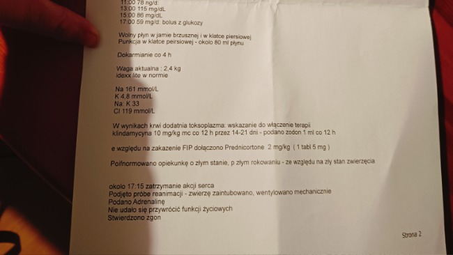 Kiedy zauważyłam że coś dzieje się z Gabi na syrenie wręcz płacząc biegłam do weterynarza aby ją przyjął tuląc to malutkie ciało w swoich ramionach . Kiedy usłyszałam diagnozę zawalił mi się świat i zaczęliśmy walkę z okropnym przeciwnikiem jakim jest fip oraz toksoplazmoza. Szukałam pomocy wszędzie, dzwoniłam, pisałam, zaangażowałam całą Polskę, aby ją ratować. Codziennie miałam kontakt z osobami które mnie wspierały psychicznie , fizycznie , finansowo. Nie spodziewałam się takiego odzewu, również z państwa strony. Każde słowo wsparcia było lekarstwem dla mojej duszy. Nigdy nie zapomnę dnia kiedy pogorszył się jej stan i biegłam z mokrą głową do paczkomatu i szpitala, aby ratować jej życie. Kiedy usłyszałam telefon, że może nie przeżyć miałam bardzo silne ataki serca. Jako osoba niepełnosprawna choruje również na serce , astmę i inne schorzenia, ale to nie było ważne - ona była wtedy najważniejsza i Anioł .