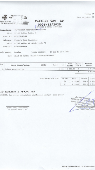 4380 zł koszty weterynaryjne. Póki co fv na część leczenia i zabiegi.