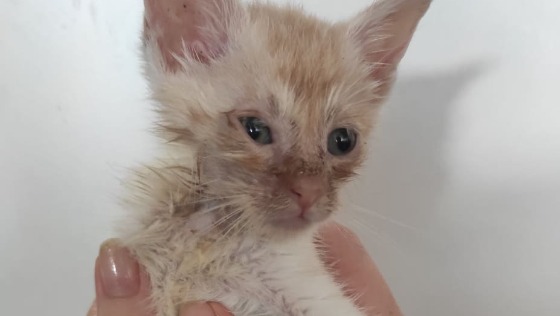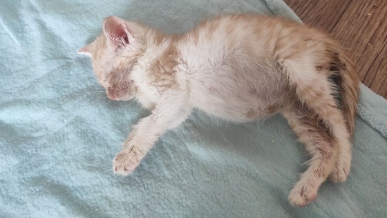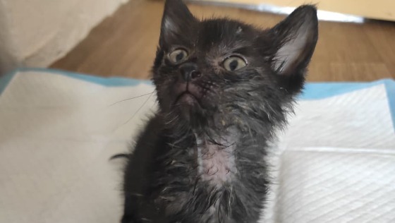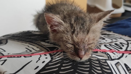 Trafiła do nas czwórka maleńkich kociątek, około 3-4 tygodniowych, podrzuconych komuś do stodoły. Maluchy były zapchlone, miały koci katar, pernamentne biegunki, były wyziębione, nie chciały jeść.