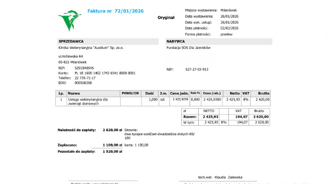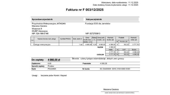 Kapsel i Korek to nasi podopieczni. Dom jeszcze nie sformalizowany, ale wygląda na to ze będzie na zawsze. Jak się to stanie oficjalnie napiszemy. Tymczasem borykamy się za faktura "za zęby" (mnóstwo innych badań w tym badania usg i serca a właściwie dwóch serc zapłacone) to ta faktura na 4000 zł