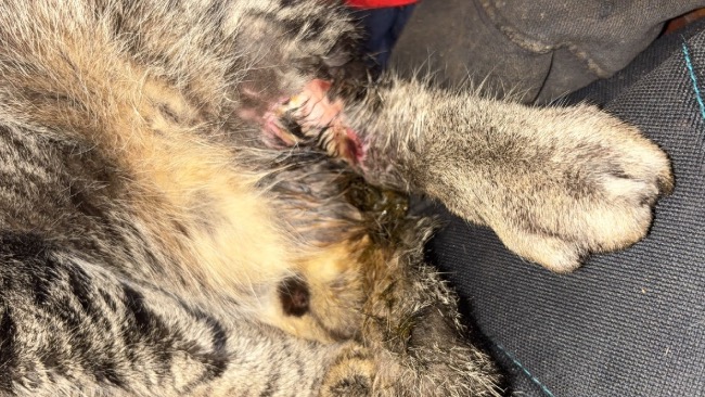 Garfield jest czteroletnim kocurem, wiekszość czasu spędza na spaniu lub przytulaniu się. Około cztery dni temu uciekł z domu. Wrócił, ale niestety jego łapa była w złym stanie. Zabrałam go do paru weterynarzy (dostał błędną diagnozę u pierwszego - złamana łapa i zapalenie skóry). U kolejnego dostał przepisane antybiotyki i kazano jechać z nim do innego miasta. Ostatecznie wyszło, że jego ścięgna i kość są na wierzchu. Wystąpiła też martwica. Leki wcześniej przepisane okazały się szkodliwe. Koszt leczenia jeden z doktorów oszacował na około trzy-tysiące.