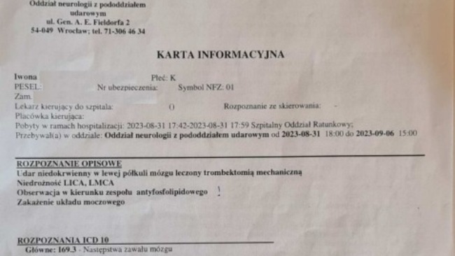 Incydent zdarzył się na wakacjach półtorej roku temu - 30.07.2023 r. Po miesiącu przebywania w szpitalu za granicą trafiliśmy na oddział neurologiczny we Wrocławiu po czym po 5 dniach wyrzucili Iwonkę do domu. Od tego czasu jestem jedynym Jej opiekunem w tym trudnym czasie. Natychmiast włączyłem rehabilitantów i do tej pory rehabilitacja jest kontynuowana. Iwonka ma codziennie od poniedziałku do piątku rehabilitację w ilości 4 h. Poza tym ma 5 x w tygodniu zajęcia z neurologopedą. To wielkie koszty, które przerastają już nasze możliwości (miesięczny koszt bez leków to ponad 22 tys. zł.). Niestety nie mamy znikąd pomocy – nasza ojczyzna nas zostawiła bez wsparcia a matka Iwonki porzuciła mówiąc – cytuję – „…- nic z tego nie będzie -…”. Ja jednak się nie poddałem i nie poddaję walcząc o zdrowie Iwonki. Sprzedaliśmy już wszystko co było wartościowe aby utrzymać intensywność rehabilitacji. Zrezygnowałem z pracy i rzuciłem się w 100% ku jedynemu naszemu celu – ku zdrowiu Iwonki.