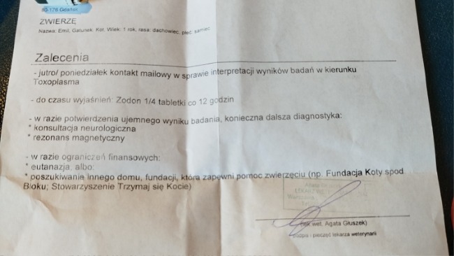 Zbieramy na badania dla rocznego Emila: rezonans magnetyczny oraz wizyta u neurologa gdyż nie jesteśmy w stanie opłacić tych badań. Chcemy się podjąć leczenia go lecz bez tych badań nie jesteśmy w stanie stwierdzić czy da się go jeszcze leczyć (grozi mu eutanazja). Kotek dostaje skurcze przez które się przewraca i leci do tyłu nie jest w stanie poprawnie funkcjonować nie może biegać, skakać. Ledwo również chodzi (trzęsie mu się pupa gdy chodzi, je lub piję) nie jest w stanie również się załatwiać w kuwecie bo z niej wypada. Będziemy/jesteśmy wdzięczni za każdą pomoc.
