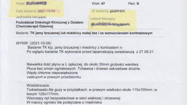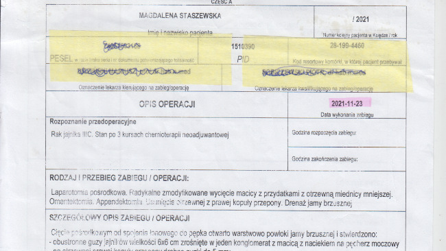 Witam Państwa! Nazywam się Magdalena Staszewska. W 2021 roku zdiagnozowano u mnie nowotwór jajnika stadium III c. Przeszłam jeden zabieg laparoskopowy oraz dwie operacje, w tym jedną radykalną (wycięcie min. jajników, macicy). Zdiagnozowano u mnie mutację genową BRCA 2. Obecnie jestem w dalszym procesie diagnostycznym w poradni genetycznej związanym z profilaktyczną amputacją piersi. Na ten moment objęta jestem programem lekowym lekiem Olaparib. Program w którym jestem obejmuje 2 lata leczenia, które w marcu tego roku kończę. Na ten moment nie ma jasności czy dalej będę mogła być leczona tym lekiem. Chorowanie na nowotwór oraz droga leczenia potrafi być traumatyzującym doświadczeniem. Znalazłam się w sytuacji destabilizacji finansowej. Wszystkie oszczędności przeznaczyłam na swoje leczenie. Obecnie zostałam jedyną żywicielką rodziny, bo osoba z którą żyję mimo wysokich kwalifikacji i doświadczenia od 4 miesięcy pozostaje bez pracy. Ja sama pracuję na własnej działalności gospodarczej (jako psychoterapeutka link do poradni www.pomoc-psychologiczna-online.pl ) .Jak choruję i leczę się to nie zarabiam. Wyczerpałam wszystkie swoje oszczędności Obecnie z powodu przeciążenia psychicznego musiałam ograniczyć liczbę godzin pracy. Sama korzystam z pomocy psychoterapeutycznej. Potrzebuję ustabilizować się psychicznie a wydatki na leczenie nie znikają, nie mówiąc już o codziennym życiu. To koszty konsultacji ze specjalistami, dojazdów do Instytutu na leczenie, suplementów, kosztownej diety, pomocy psychoterapeutycznej oraz utrzymania mojej rodziny.