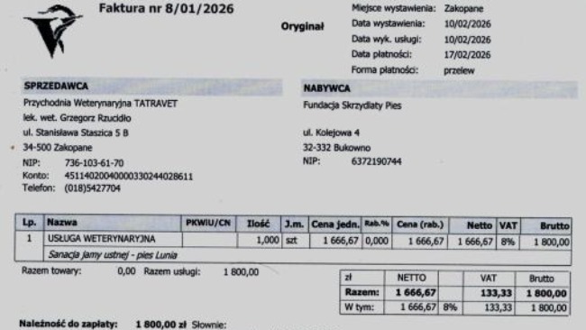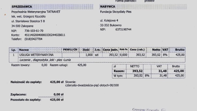 Dotychczasowy koszt diagnostyki i zabiegu wyniósł 2225,00 zł. Kwota ta jeszcze wzrośnie, ponieważ czekamy na ostatnią fakturę z lecznicy.