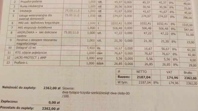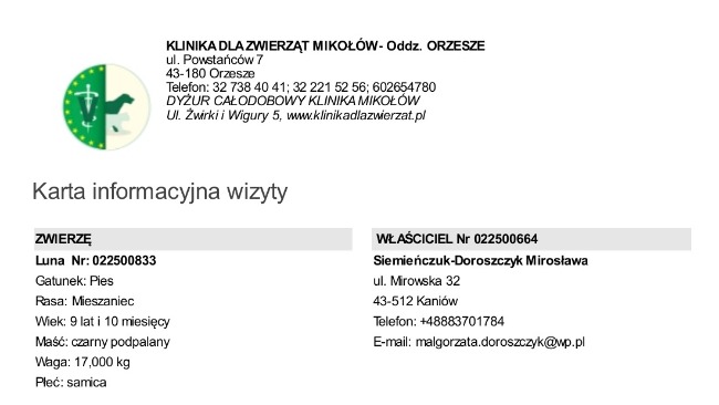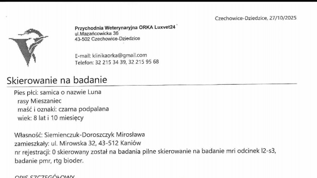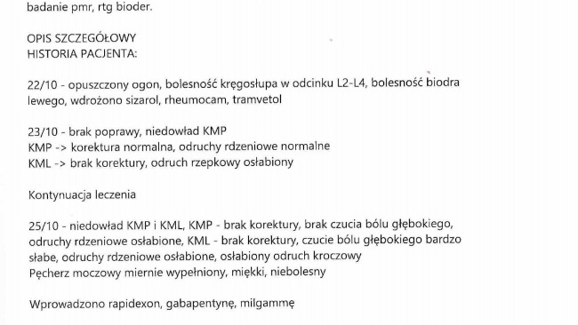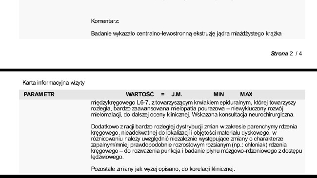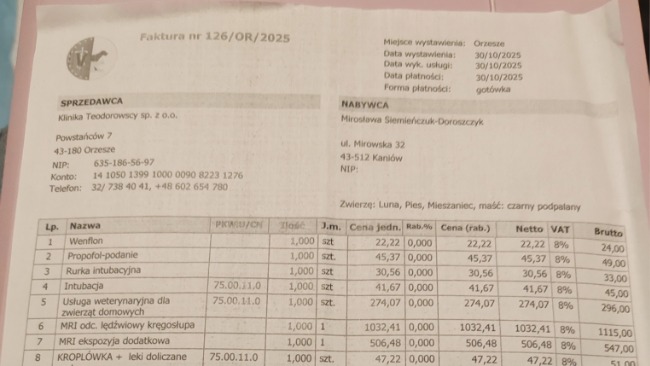 Oto skrócony opis rezonansu wykonanego w Klinice Teodorowscy w Orzeszu, a także faktura za wykonane badanie.