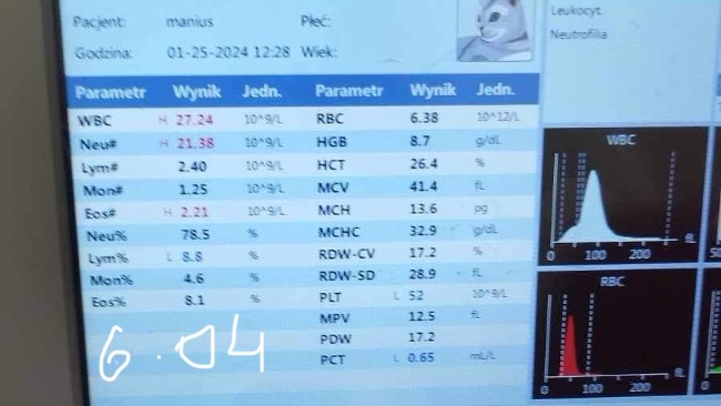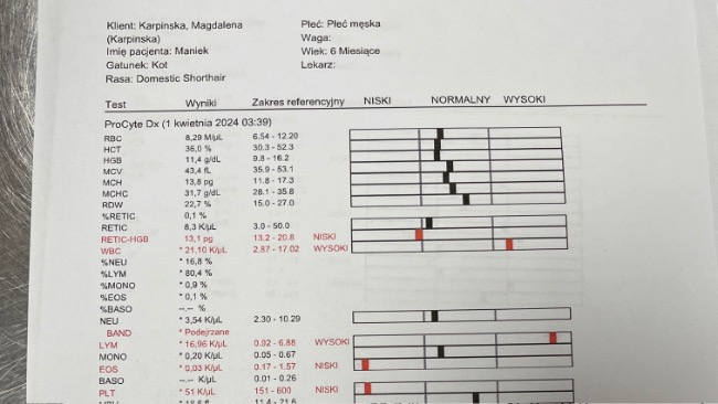 Od 22/03 Manio gorzej się czuł ale nie jakoś bardzo tylko stał się bardziej senny, mniejszy apetyt a był kociakiem pchającym się non stop pod ludzkie dłonie. Pojawiła się gorączka trudna do zbicia ale może to ząbki … 23/03 wykonane zostały badania krwi, które właściwie nic dramatycznego nie pokazywały choć morfologia troszkę zaczynała niepokoić.