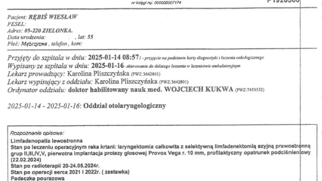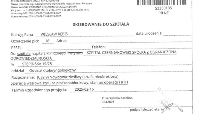 Pomóż pokonać raka ! Proszę o wsparcie i pomoc finasową dla Wiesława Rębisia. Jest to bliska mi osoba z mojej rodziny. 22-02-2024 przeszedł operację usunięcia złośliwego raka krtani i gardła. Karmiony dojelitowo przez PEG. Dzisiaj 08.03 po odbiorze wyników, jego nadzieja prysła. Pojawiły się agresywne przerzuty. Nadzieja umiera ostatnia i wierzymy że pokona tego "złośliwca". Więc serdecznie prosze o pomoc w jego pokonaniu. Liczy się każda złotówka, bo ten człowiek utrzymuje się tylko renty chorobowej po przebytych w 2021-2022 operacjach zastawek serca. Od 15-03 zaczyna się walka o życie - radioterapia i chemioterapia. Serdecznie proszę ludzi dobrej woli o pomoc. Dziękuję