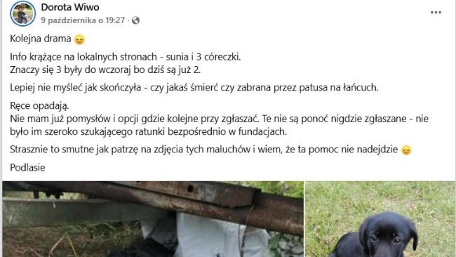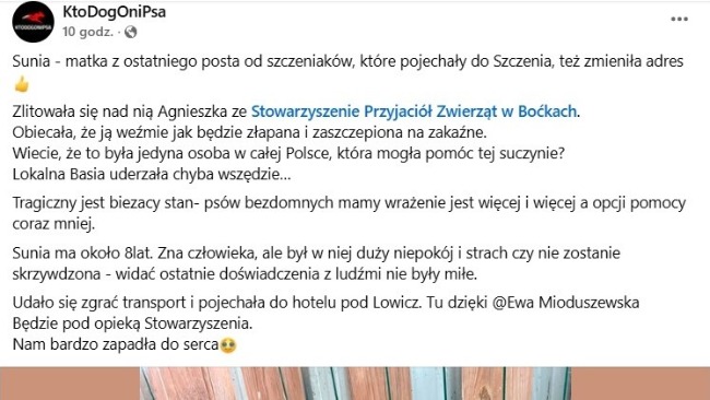 Nadmiar miejsca i pieniędzy nam nie grozi, ale widok tej bezdomnej suni koczującej w polu nie dawał nam spokoju. Obserwowaliśmy kolejne posty o niej i nikt chętny się nie pojawiał. Miał inny nasz podpieczny jechać do hoteliku, ale w tej sytuacji daliśmy znać do Dorota Wiwo, że jeśli inna pomoc się nie znajdzie , to miejsce w hoteliku zarezerwowane. Tylko tyle mogliśmy zaproponować.