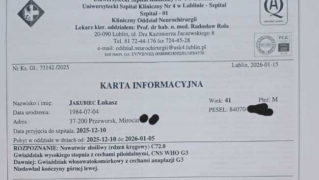 20 sierpnia 2025 roku przeszedłem pierwszą, ponad pięciogodzinną operację neurochirurgiczną. Guz udało się usunąć tylko częściowo. Po operacji obudziłem się bez czucia w rękach i nogach.