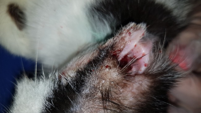 Dwa wielkie guzy w uszach, lejąca się krew i ogrom kociego cierpienia.