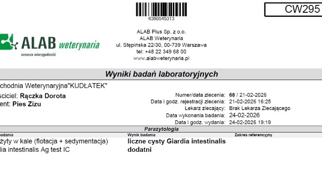 Hamza ma giardie. Badanie jest na Ziza bo próbka była zbiorcza od wszystkich 3 psów. Zizo był już leczony z tego paskudztwa i znow mamy😢 Takze teraz wszystkie 3 psy i 7 kotow musi byc przeleczone co daje astronomiczny koszt😢