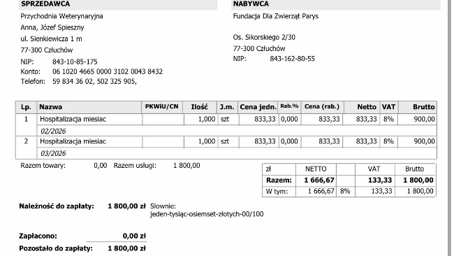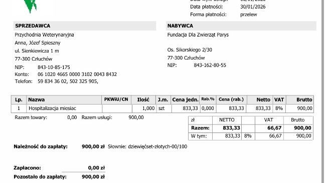 Zbiórka założona jest na kwotę całoroczną opłat tj. 900 zł brutto czynsz + 180 zł brutto wywóz śmieci.