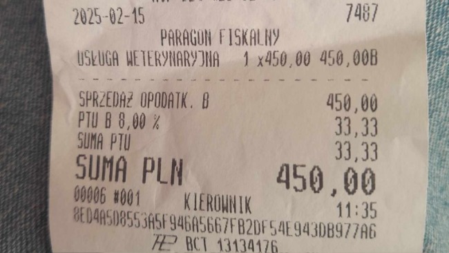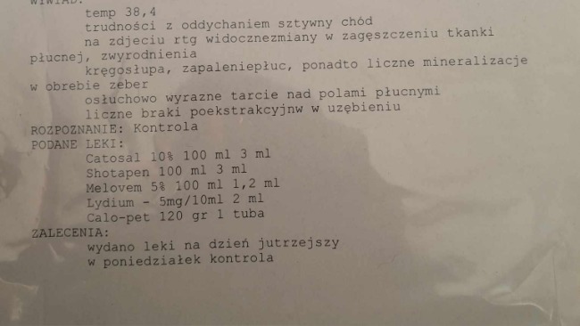 Poniżej paragony z wizyt oraz opis od weterynarza.
