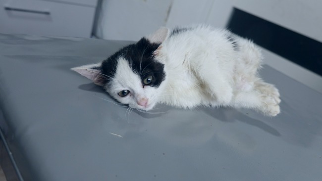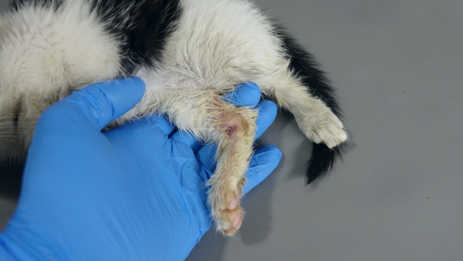 Ma ogromnego krwiaka na lewej tylnej łapce, a RTG wykazało połamanie nasady dalszej kości udowej. To młody kotek, który szybko rośnie. Żeby nie być kaleką, musi przejść pilny zabieg chirurgiczny naprawy łapki!