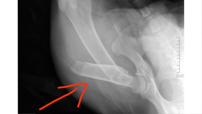 Baloo, bo tak dostał na imię, trafił do schroniska z okropnym złamaniem. Kość udowa w lewej tylnej łapie jest złamana w połowie długości.