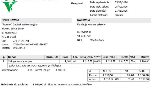 Z uwagi na to, że zarówno nam jak i Pani weterynarz zależało na szczęśliwym zakończeniu historii Łatki, faktura została wystawiona tylko za przebyte leczenie, zaś koszty "hotelu" i wykarmienia kotki wzięła na siebie Pani Edyta za co bardzo dziękujemy!