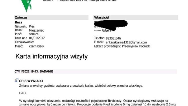 Beza miała robioną biopsje guzka (opłacona), który znajduje się na karku. W badaniu nie wyszło nic groźnego, ale po upływie jakiś dwóch tygodni od punkcji guzek jakby urósł, a więc musiałyśmy zrobić kolejną. Na samą Bezę uzbierałyśmy tylko na rtg, bo przyjechała do nas zaszczepiona i w miarę ogarnięta. Po drugiej biopsji dostała steryd, ponieważ guz, to odczyn prawdopodobnie po ukąszeniu. Badania i leki kosztowały nas 200 zł. 6 grudnia Beza musi przejść szczepienia. Kajtkowi musimy zrobić kolejny raz badania kału, to koszt około 120 zł. Naszego szczeniaczka Świstka musiałyśmy przez tydzień leczyć ( nie wiemy jeszcze ile będziemy miały do zapłaty za codzienne wizyty u weta), ponieważ miał szmery na oskrzelach, gdy już doszedł do siebie okazało się, że ma zapalenie ucha. Sama maść kosztowała nas 70 zł.