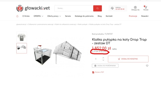 W łapaniu kotów bardzo przydatna jest klatka pułapka Drop-Trap, jej cena brutto to 2 277, 96 zł.