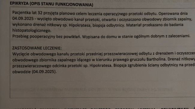 Mam na imię Anna, mam 32 lata. Jeszcze niedawno prowadziłam normalne życie. Wszystko zmieniło się w marcu tego roku – początkowo pojawił się silny ból i ropień w okolicach odbytu. Sądziłam, że to chwilowa infekcja. Niestety, po licznych badaniach okazało się, że choruję na bardzo złożoną i głęboką postać przetoki okołoodbytniczej, która przebiega przez mięśnie zwieracza odbytu.To poważna i postępująca choroba, która bez skutecznego leczenia – może doprowadzić do trwałego kalectwa, a nawet zagrozić mojemu życiu. Przetoki i ropnie to otwarte ogniska zapalne, które mogą prowadzić do rozsiewu bakterii po całym organizmie i wywołać sepsę stan bezpośredniego zagrożenia życia.Codziennie żyję w bólu, z wyciekami ropy, gorączką i stanami zapalnymi. Nie mogę normalnie pracować, siedzieć ani spać. Zwykłe funkcjonowanie stało się walką.