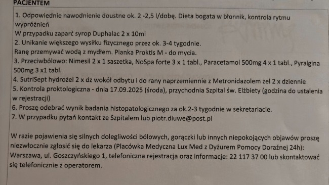 Chciałabym podzielić się z Wami ważną aktualizacją. 4 września 2025 roku przeszłam planowaną operację wycięcia przetoki odbytu. Zabieg był dość skomplikowany usunięto przetokę, oczyszczono zbiornik zapalny i założono dren nitkowy metodą Hipokratesa. Dodatkowo wykonano biopsję zmian, bo taka zaistniała w okolicy odbytu, a na wyniki muszę poczekać jeszcze około 2–3 tygodnie. Na szczęście operacja przebiegła bez powikłań i zostałam wypisana do domu z zaleceniami. Obecnie jestem w trakcie rekonwalescencji, rana wymaga codziennej pielęgnacji, przyjmuję leki przeciwbólowe i przeciwzapalne, a 17 września czeka mnie kontrola proktologiczna. Dzisiaj, 9 września, znów wybieram się do apteki po kolejne opatrunki i czopki przeciwbólowe, bo wszystko bardzo szybko się zużywa. Koszt leczenia do tej pory to prawie 11 tysięcy złotych 10 613 zł za sam zabieg, znieczulenie i pobyt w szpitalu, oraz ponad 373 zł za leki i materiały medyczne. I to nawet nie licząc tego, że musiałam zapewnić sobie nocleg w Warszawie od 2 do 7 września oraz zorganizować dojazdy, bo wiadomo, w takim stanie nie da się podróżować komunikacją publiczną. To wszystko było możliwe tylko dzięki Waszej pomocy i za to jestem naprawdę ogromnie wdzięczna. Jeśli wszystko pójdzie dobrze i dojdę do siebie, dostanę kolejny termin na dalszą operację, więc leczenie niestety jeszcze się nie kończy. Jeśli ktoś mnie zobaczy gdzieś na mieście śmiało możecie podejść, pogadać, zapytać co u mnie, jak się czuję, to zawsze miłe i daje siłę. Dziękuję, że jesteście ze mną.