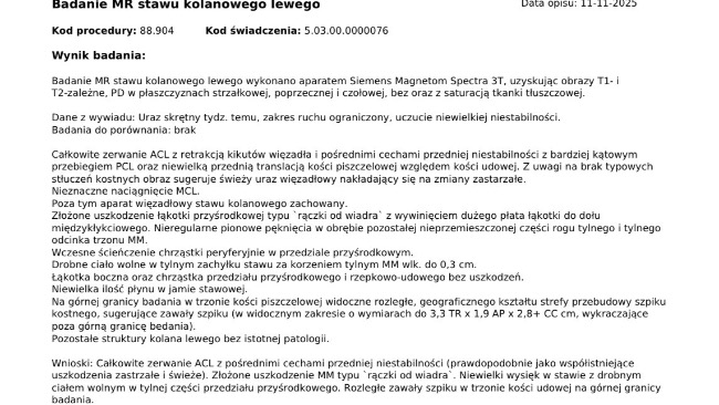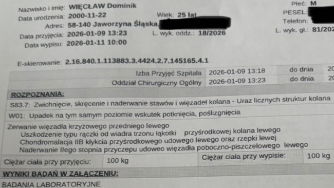 Historia zaczęła się w 2021 roku podczas meczu o mistrzostwo klasy A doznałem kontuzji naderwania więzadła ACL. Chcąc jak najszybciej wrócić na boisko po kilku próbach treningowych i powrotu z myślą że już wszystko się wyleczyło , nastąpiło całkowite zerwanie więzadła krzyżowego . Po kilku miesiącach leczenia rehabilitacjami i braku możliwości operacji ze względów pracy wróciłem do gry z ortezą usztywniającą-mimo zakazu lekarza. Spowodowane to było brakami kadrowymi w drużynie w której gram i chęci pomocy kolegą z boiska w walce o najwyższe cele. Niestety skończyło się powiększeniem kontuzji o więzadło boczne (zerwanie) i uszkodzenie łękotki typu ,,rączki od wiadra’’ co określił lekarz najgorszym z możliwych bo blokuje teraz wyprostowanie kolana i skutkuje natychmiastową potrzebą operacji. W pierwszym etapie więzadło boczne i łękotka, które są refundowane w szpitalu w którym będę miał operację dnia 9.01.2026, natomiast druga planowana na 07.2026 - więzadło krzyżowe nie jest refundowane i koszt takiej operacji 22 tys, + koszty rehabilitacji 8 tys. Suma niestety przewyższa moje możliwości i skończy się albo na pierwszej operacji i brakiem powrotu do sportu, lub na dwóch operacjach z czego koszt całkowity drugiej to 30 tyś złotych.
