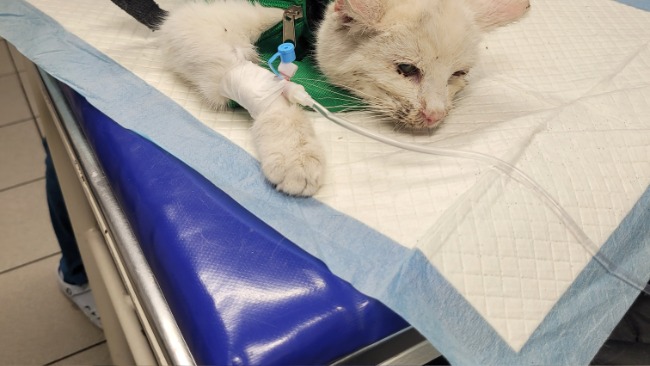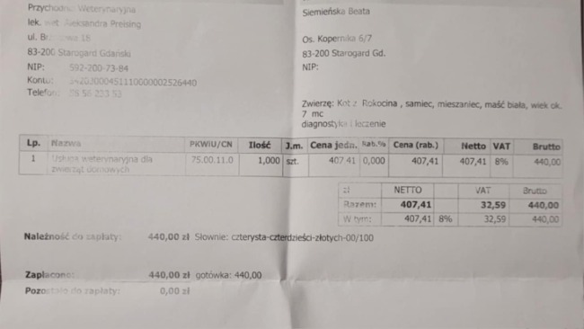 Przede wszystkim zajmuję się sterylizacją kotów, żeby zapobiegać bezdomności. Od połowy stycznia do teraz odłowiłam 81 kotów, które poddane zostały sterylizacji i kastracji. Środki pozyskane zostały z Gminy Starogard Gdański. Urzędu Miasta Starogard Gdański i środków własnych. Niestety zdarzają się też koty chore, które wymagają leczenia. Takie leczenia trzeba pokryć z własnych środków. Ostatnio odłowiony został biały kocurek, który wymagał natychmiastowej pomocy lekarza. Po badaniach okazało się, że jest w stanie ciężkim. Odwodniony, wychudzony, z wielką nadżerką na języku. Zostały mu podane kroplówki, antybiotyk. Kocurek karmiony jest strzykawką, Potrzebuje płynnej, wyskowartościowej karmy, która niestety jest droga. Bardzo proszę o pomoc w pokryciu kosztów leczenia. Po zakończeniu leczenia kocurek będzie szukał kochającego domku.