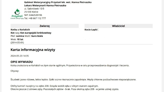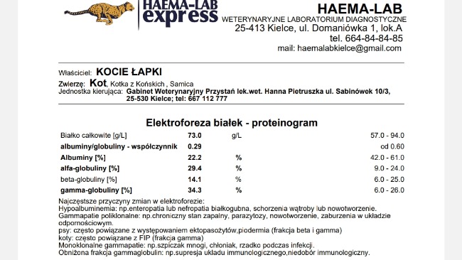 Kotka jest w toku terapii wspomagającej nerki oraz otrzymuje preparat p/wko endopasożytom, ze względu na stwierdzoną obecność członów tasiemca w kale. Jest w trakcie antybiotykoterapii , otrzymuje również osłonowo probiotyk. Czekamy na wynik elektroforezy.