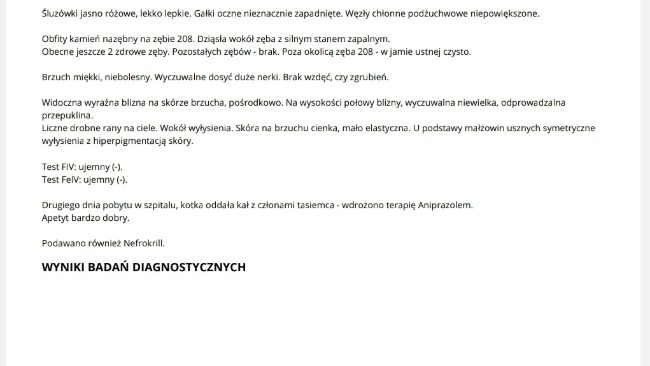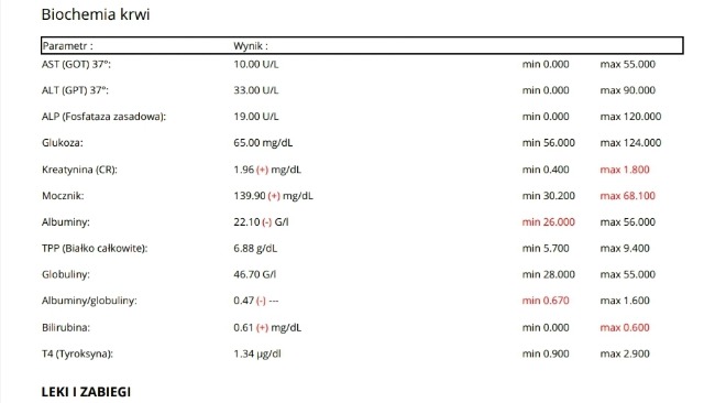 Parametry nerkowe są fatalne, czekamy na kolejne wyniki. Najważniejsze, że ma apetyt.