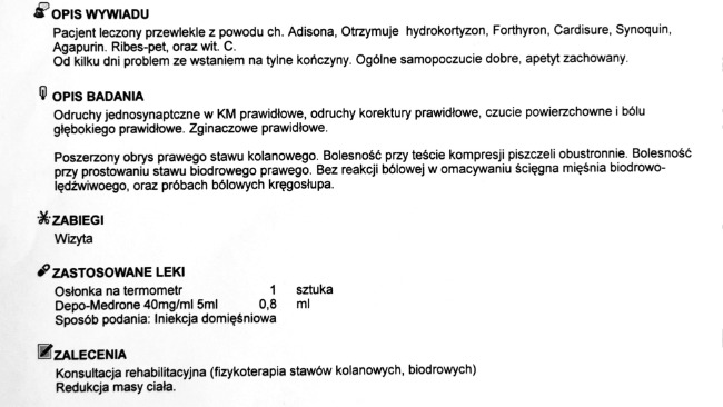 Poszerzony obrys stawu kolanowego prawego świadczy o postepującym procesie zwyrodnieniowym wraz ze stanem zapalnym. Natomiast obustronnie występuje bolesność stawów kolanowych.