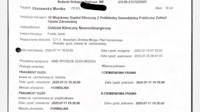 Niestety, Monice odmówiono terapii Nanotherm oraz protonoterapii. Obecnie jest już po pierwszej dawce chemioterapii, a na ten moment lekarze nie mają dla niej innych standardowych możliwości leczenia.