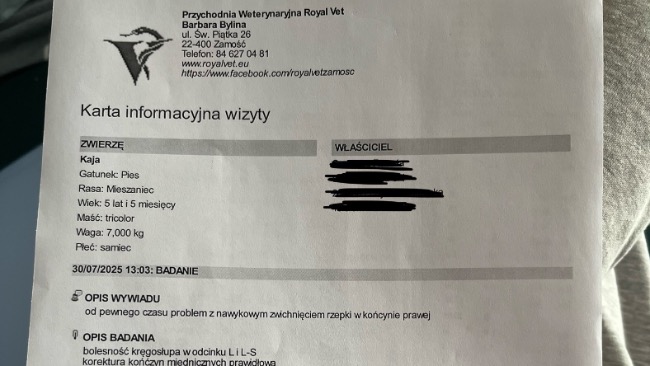 Mam psa o imieniu Kaja, ma 5 lat i jest pełną energii suczką, która kocha biegać, bawić się i spędzać czas z moją rodziną. Niestety, wykryto u niej zwichnięcie rzepki w jej tylnich łapach , życie stało się dla nas o wiele trudniejsze. lekarz powiedział, że potrzebuję operacji, by móc normalnie chodzić . 2500 to koszt operacji jednej rzepki, do tego dochodzą koszty leków, fizjoterapii, rtg, echo serca, morfologia, i wizyty kontrolne,a moja rodzina nie jest w stanie pokryć tej kwoty sama, mimo szukania długo pracy, nie udało mi się jej znalezdz, jedynym wyjściem jest zbiórka🥲 w przeciwnym razie zrobią jej się zwyrodnienia w rzepce. Staram się dołączyć jak najwięcej dokumentów i potwierdzeń co do diagnozy, aby nikt nie miał wątpliwości co do legitnosci zbiórki. aktualnie dalej leczymy i diagnozujemy. Dziękuję za całe wsparcie
