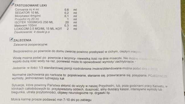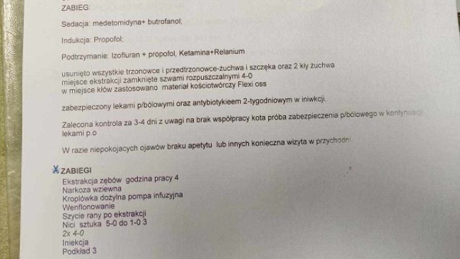 Zabieg odbył się planowo. Miał pobraną krew na morfologię i biochemię, pobrany mocz do badań i rtg zębów. Niestety trzeba było usunąć wszystkie poza 2 kłami. Zabieg był trudny bo trwał 4 godziny, ale to była konieczność by żył bez bólu i stanów zapalnych w pysiu.