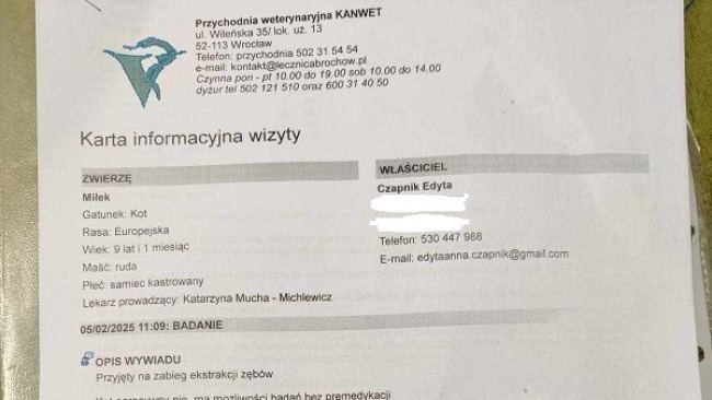 Tak było:Wybita częśc zębów, poturbowany i obolały. Chudy i głodny bo przeganiany przez inne koty. Smutny i niczyj. Taki obraz rozpaczy bytował na mojej ulicy przynajmniej od grudna 2023. Myslałam, ze jest czyjś bo wskoczył na balkon na parterze, ale wskoczył dlatego że szukał schronienia w bardzo zimny dzień. Kiedy go znowu zobaczyłam był jeszcze chudszy i kulał. Ogłosiłam Go znów na grupie z nadzieją, że ma dom, że ktoś na niego czeka, karmi, zajmie się Jego bólem. Rozpytałam sąsiadów i okazuje sie, że błąka się w mojej okolicy od sierpnia 2023.Udało mi się Go złapać i umieścić w szpitaliku mojej zaprzyjaźnionej Lecznicy. Rudy przystojniak dostał na imię Miłek od nazwy ulicy. Według sąsiadów miał wtedy 1,5-2 lata choć przez wybite zęby nie można oszacować wieku. Przeszedł badania krwi , ma ujemne testy na choroby zakaźne, mykoplasmę i nicienie płucne. Został odpchlony, odrobaczony i wykastrowany, a jego dziąsła zostały zaopiekowane na tyle na ile było to wtedy możliwe.