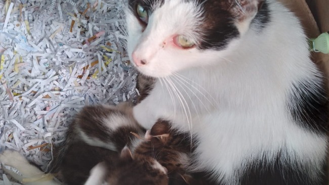 Mamusia i 8 maleńkich kociaków.