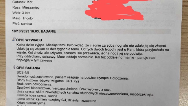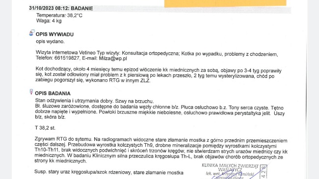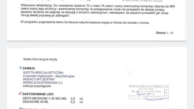 Zosia była na konsultacji u najlepszego ortopedy w Poznaniu, który dostrzegł złamanie mostka i zalecił rehabilitację a po jej zakończeniu zostanie oceniona czy kwalifikuje się do operacji. W opłaceniu wizyt pomogła Gmina Stęszew, jedna z fundacji i dom tymczasowy. Niestety potrzebne są pieniądze na rehabilitację, gdyż są to duże koszty a jedna wizyta to koszt nawet ok 100 złotych. Zosia powinna mieć ok 10 zabiegów. W tym nie pomoże już Gmina, bo rehabilitacja bezdomnego kota nie jest w ich zakresie pomocy... Fundacja jedyna która pomogła i zareagowała na prośbę o pomoc- wizyta u Ortopedy była 2 listopada i od tamtej pory nic nie udało się zorganizowac a Zosia nie powinna czekac bo ma to wpływ na jej sprawność.