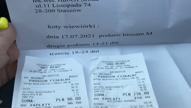 Dzisiaj tj. 1.07.21 r. byłam z 8 kotkami u weterynarza. Zrobiliśmy 5 testów FelV/Fiv, 6 szczepień, 3 czipowania i odrobaczenie x2. Rachunek opiewa na 450 zł :( 100 zł mamy od Gosi i Ani. 350 zł będziemy musieli dozbierać, żeby móc ruszyć dalej. Za tydzień do szczepienia Candy i drugie szczepienie Zosi. Karol powinien mieć operacje a Amber chciałbym skonsultować z neurologiem ale wszystko po kolei.