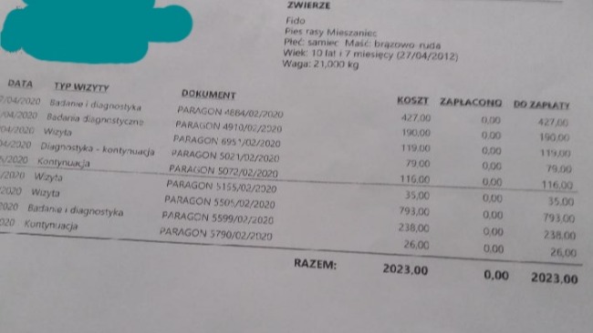 Zwracam się do wszystkich, którym nie jest obojętny los pokrzywdzonych i porzuconych zwierząt. Fido jest pieskiem wyrzuconym na ulicę... Pani Maria, która poprosila mnie o pomoc przygarnęla go do swojego domu. Nie potrafiła zostawić go na ulicy, zważając przede wszystkim na warunki pogodowe jakie istnieją. Nazwała go Fido, bardzo się do niego przywiązała. Jednak bardzo szybko okazało się, że Fido ma problemy ze zdrowiem, ma ogromne kamienie w pęcherzu. Kilka dni temu zatrzymał mu się mocz, Pani Maria 3,5 godz spędzila z nim na lecznicy. Musiala zaplacic za dwie wizyty 580 złotych. Pani Maria ma bardzo niska emeryture, jest to zaledwie 787 złotych miesięcznie. Poniżej załączam potwierdzenie przesłane przez Panią Marie. Problemy finansowe nie powstrzymaly Pani Marii od przygarnięcia Fido oraz oddania ostatnich srodkow jakie posiadała, aby zaplacic za pomoc weterynarza. Fido wymaga codziennego cewnikowania, wymagana jest operacja, która odbędzie się w najblizszy czwartek o godz. 13. Koszt to ok. 2000 złotych. Pani Maria nie posiada takich środków, zalega też z opłatami za poprzednie wizyty. Bardzo prosimy o pomoc dla Pani Marii. Fido daje Jej tak wiele radości. Zbliżają się Święta Bożego Narodzenia...pomożmy Pani Marii i Fido. Nie zostawiajmy ich, kazde nawet najmniejsze wsparcie ma ogromne znaczenie.