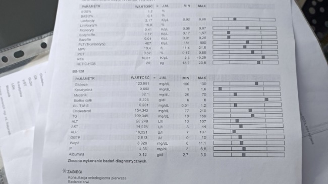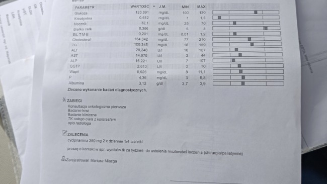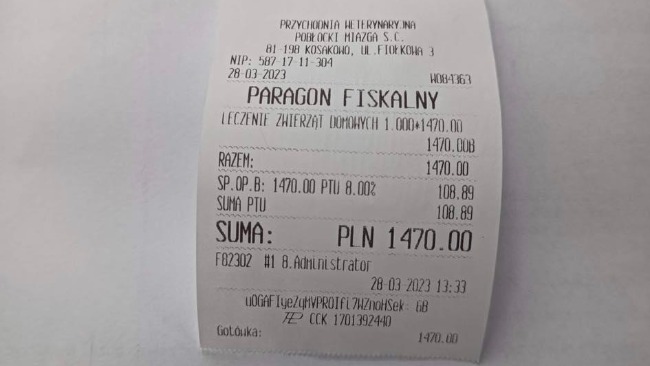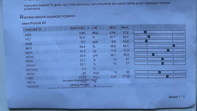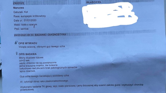 Dzisiaj wizyta u onkologa. Kotka miała robione badanie krwi, cytologię i tomokomputer. W cytologii jest obraz raka płaskonabłonkowego. Pierwsza wizyta 1470. Zalecona operacja, planowana na 13.04.