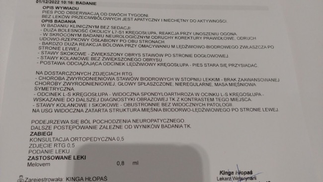 Psikus wykazuje dużą bolesność w okolicy L7-S1 kręgosłupa i bardzo dużą bolesność w okolicy lędźwiowo-biodrowej. Zdjęcia RTG wykazują widoczną spondylozę kręgosłupa, która do decyzji odnośnie dalszego postępowania wymaga dokładniejszej diagnostyki obrazowej - tomografii z kontrastem.
