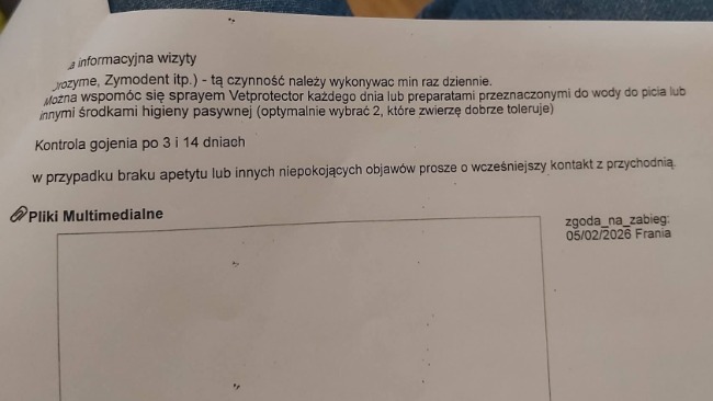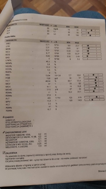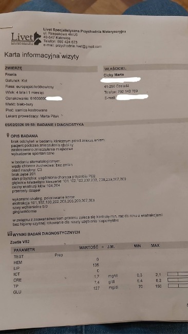 Niestety, w związku ze stomatologicznymi problemami (i zaawansowaniem procesu) które ma i które to jeszcze bardziej zmniejszają jej i tak już małą szanse na adopcję (opis od stomatologa na zdjęciu) w przyszłości będą jej musiały stopniowo zostać usunięte wszystkie pozostałe 😔 (no, chyba że byłyby jej codziennie myte i dodatkowo psikane specjalnym sprayem co jest przy jej nieobsługowości w domu totalnie i absolutnie niemożliwe). Bez higieny czynnej rokowania dla reszty uzębienia są niekorzystne. Ma więc zalecenie żeby pojawiać się przynajmniej raz w roku na kontroli -zabiegu z ekstrakcjami. Dostała syropek przeciwbólowy na kilka dni. Za ten zabieg z badaniem krwi wyszło łącznie 1480 zł.