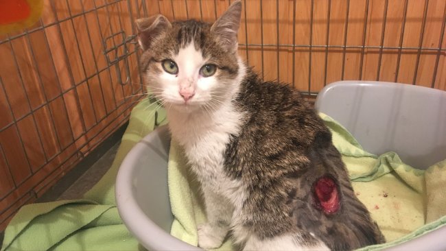 (Zuzia - kotka z raną na grzbiecie, trafiła do nas prosto z ulicy. )