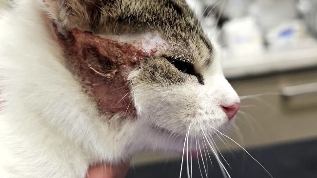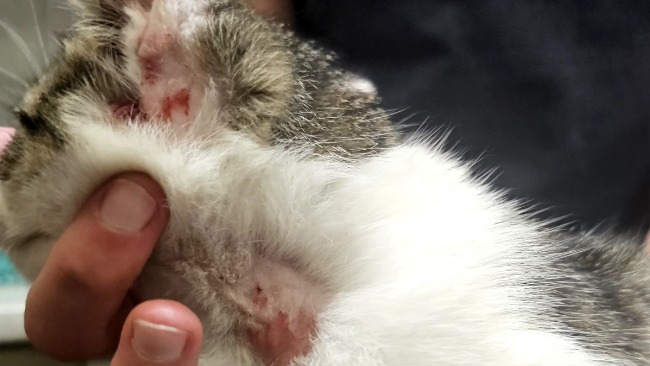 Kociątko z wielką łagodnością znosi codzienną toaletę ran, jest bardzo wdzięczne.